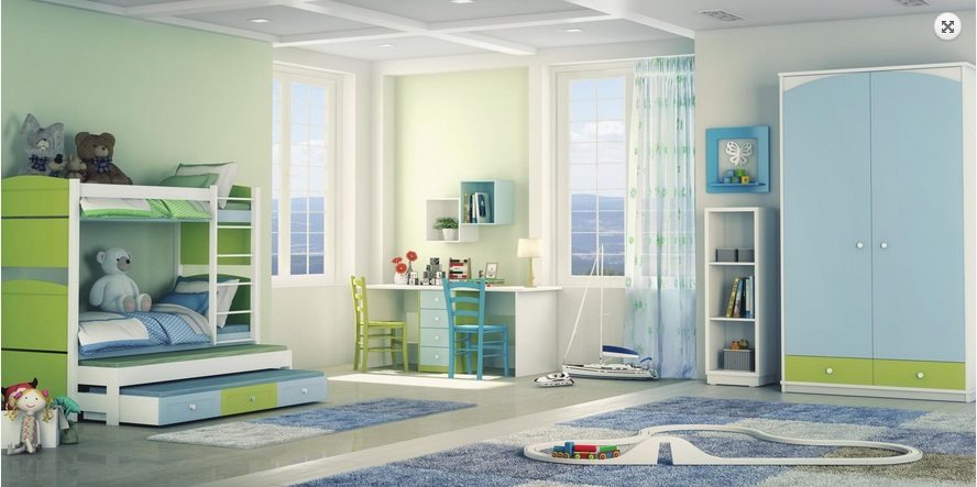 בתמונה ניתן לראות כי שילוב הגוונים הרענן מאפשר למיטת הקומותיים להראות קלילה ולא להכביד על החלל. בנוסף, הצבעוניות מתאימה לבנים ולבנות כאחד, ובהחלט ניתן להשתמש בה בחדרים משותפים לאח ואחות. ניתן להגדיר את האביזרים ה"תכולים" כממלכה של אחד הילדים ואת אביזרי ה"ליים " כשייכים לילד השני בחדר, וכך ליצור אבחנה ותחושת ייחוד של כל אחד מהילדים.